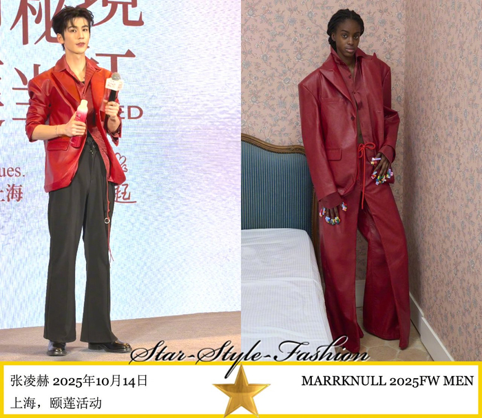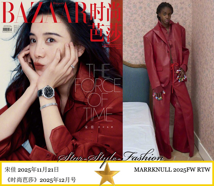 #公共怒撞不皱衫# 宋佳身着MARRKNULL2025秋冬系列红色假两件皮革西服外套登《时尚芭莎》2025年12月号,与张凌赫撞衫。