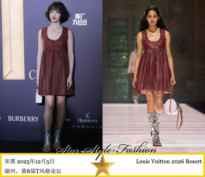 宋茜身着LV2026早春系列酒红色皮革镂花娃娃裙亮相。