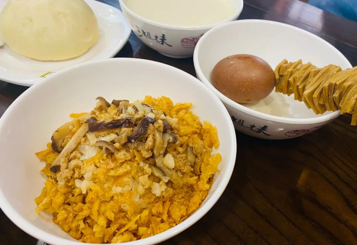 一碗糯米饭淋一勺肉末香菇汤,撒上切成小段的脆油条,嚼起来香脆又软糯,配上一串豆干和一碗豆浆,开启一天的元气满满。