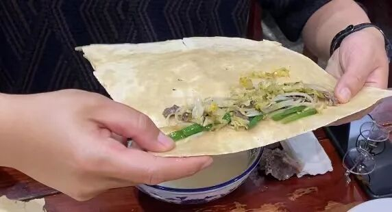 最后,还想安利一个楠溪江的小吃麦烫锅,麦饼的馅夹在里面,而麦烫锅则更像一种薄薄的pancake,这种大锅烫烙出来的“锅形”麦煎饼皮吃起来很脆。具体的吃法是把菜夹在其中包裹成一个长条状,饼皮外酥配菜里嫩,两张饼下肚不知道有多满足。